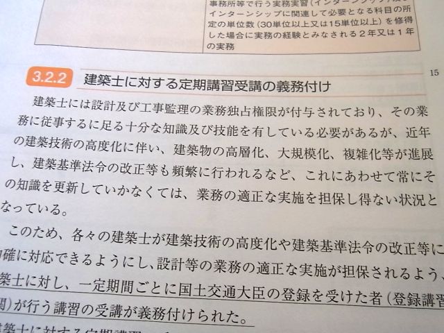 このようなことが二度と起こらないように、平成18年12月20日に公布された新建築士法では、建築士事務所に所属している建築士には、3年ごとの建築士定期講習が義務付られました。