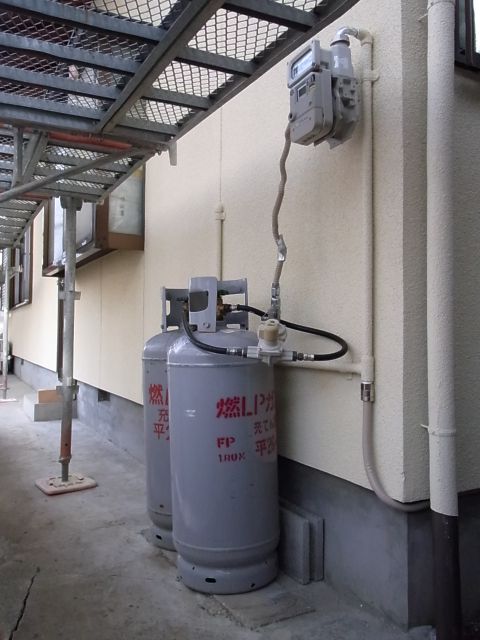 ガスさんが、ボンベからボイラーまでのガス配管接続とボイラーの調整!