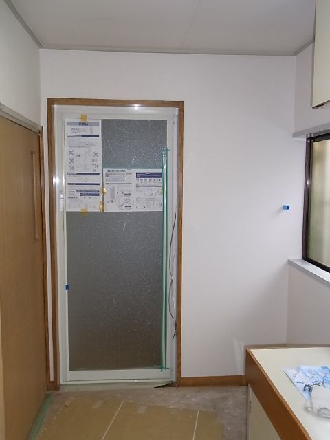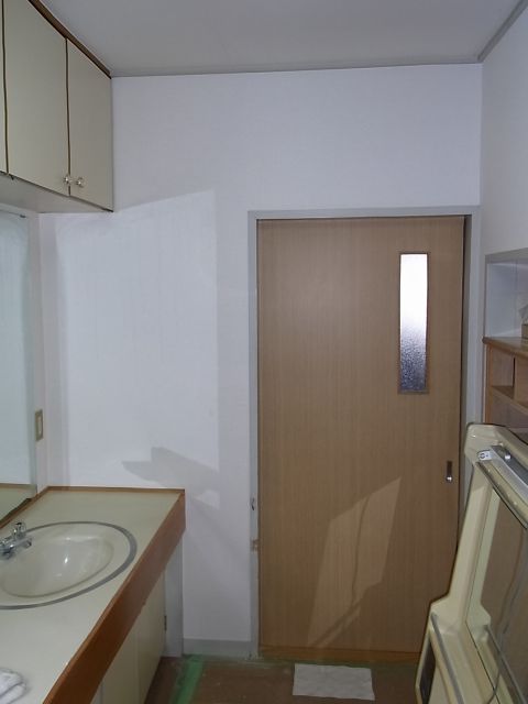 二階が作業中だったので、洗面脱衣の外したキャビネットを取り付けました。