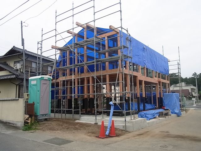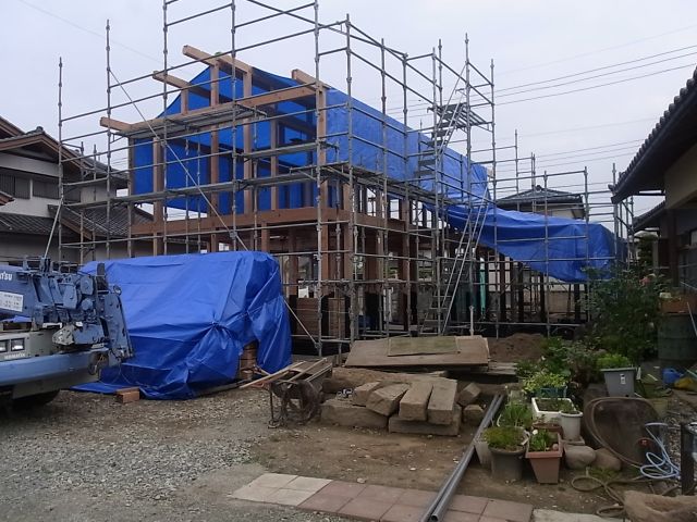 基礎工事から約一ヶ月、無事2階建部分の棟木、平家部分の垂木まであがりました。