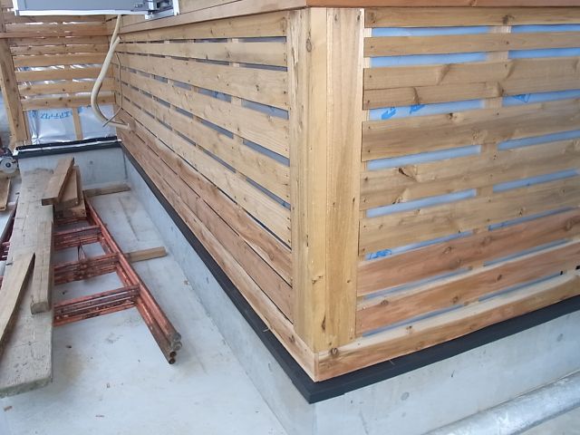 水切・防虫通気部材も取付けられたので、外壁のザラ板張りが施工されました。