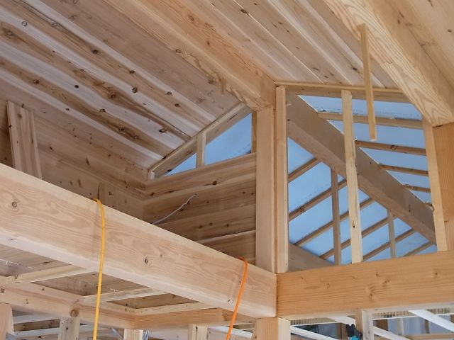 ロフトの見切りの付柱取付と杉板張りがはじまりました。