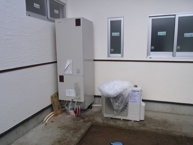 エコキュートの設置と配管接続、二箇所コントロールパネル取付が行なわれました。