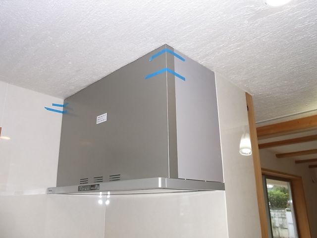 レンジフードカバー取付。IHとシステムキッチンの取合いコーキング。
