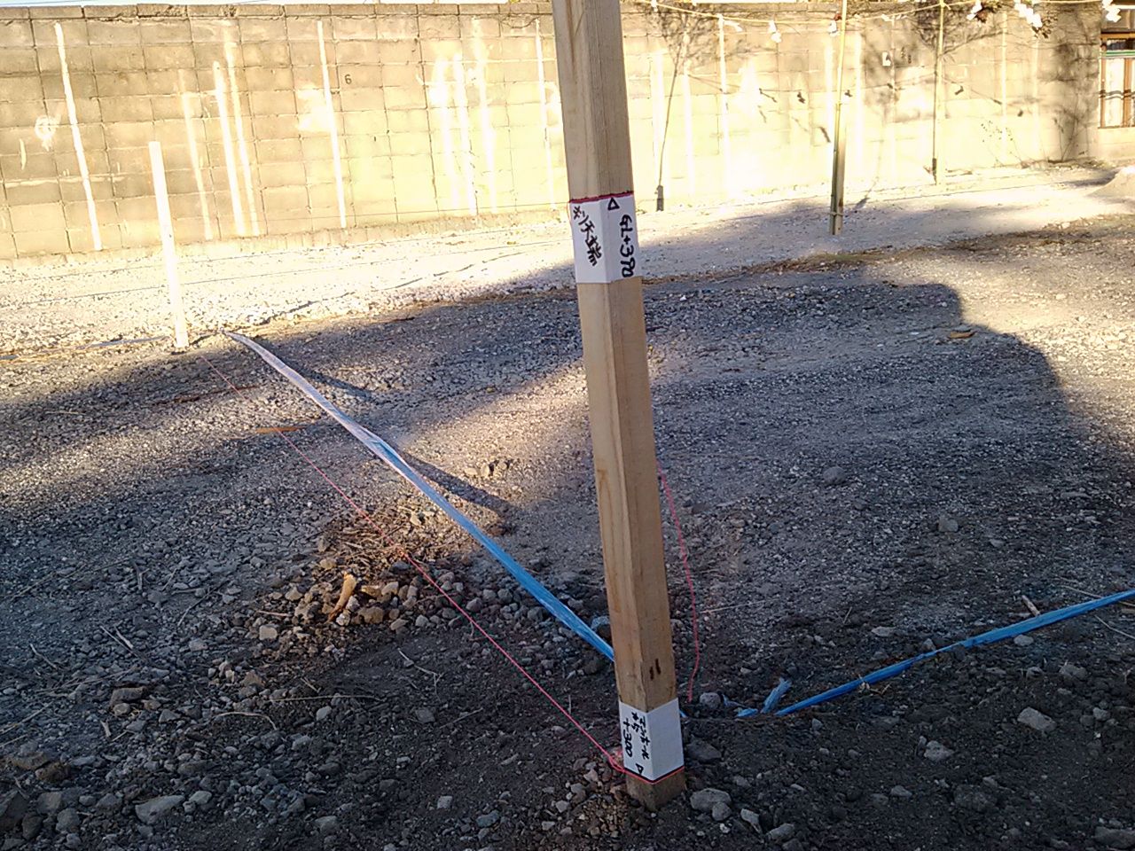 その杭をもう一箇所、計二箇所つくり、糸を張って現場に来ればすぐ打合せができるようにしておきました。