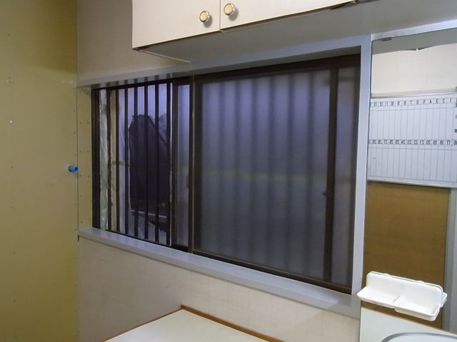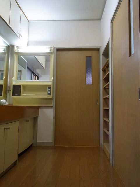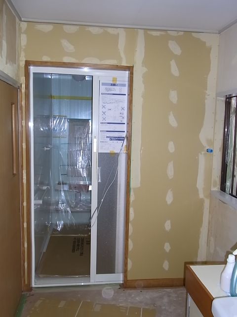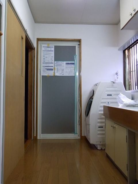 二階が作業中だったので、洗面脱衣の外したキャビネットを取り付けました。
