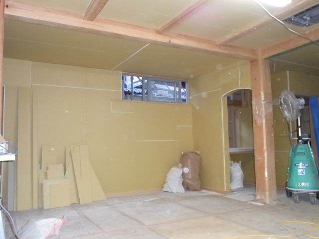 壁のプラスターボード張りが完了しました。