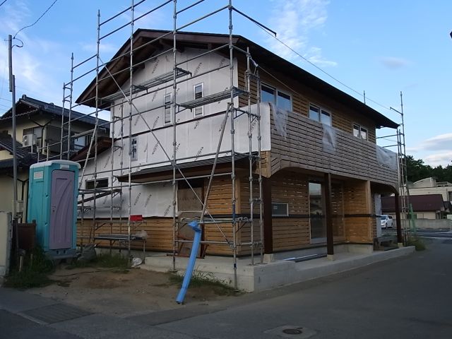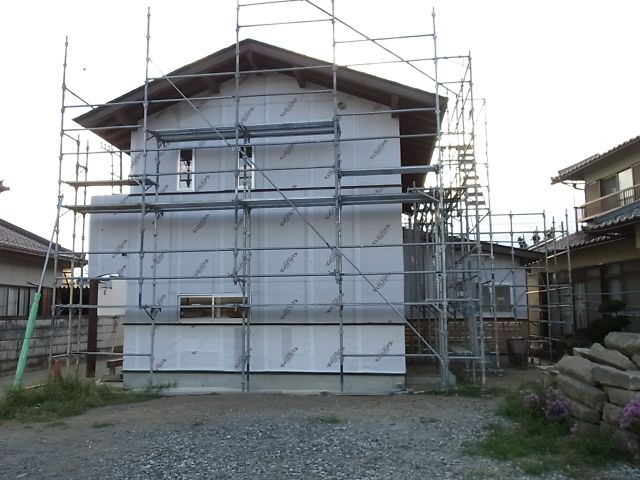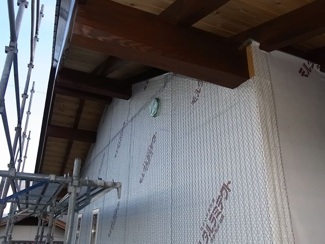 左官屋さんが、透湿防水シートと波ラスの張付けを行いました。