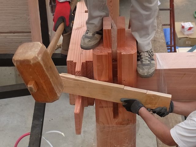 接合部に金物を一切使わず、栓や車知栓等で複雑な継ぎ手を使い、接合部を硬くがっちり締め固めます。
