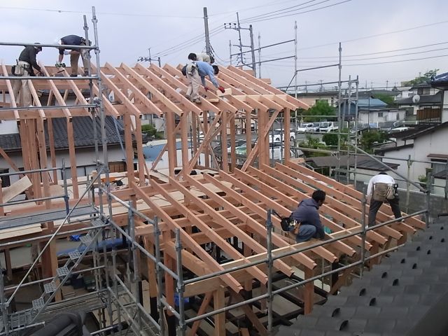 普段登り梁を使う事が最近多いのですが、A邸は化粧垂木で4寸勾配にしました。