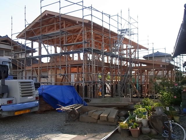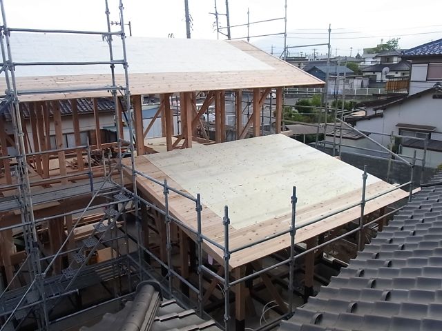 昨日に引き続き、建て起こし、ベランダ部分と垂木・野地板張り