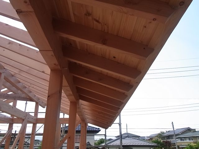 母屋も化粧垂木で4寸勾配です。仕上は違いますが、統一しました。