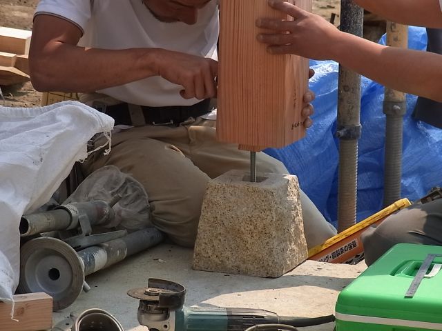 自然石の束石にしているので、柱の加工や位置を決めるのに調整しながら組んでいました。