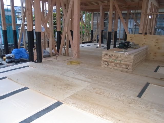 火打土台、火打梁を使わないので、24㎜構造用合板を千鳥張りにして張ります。