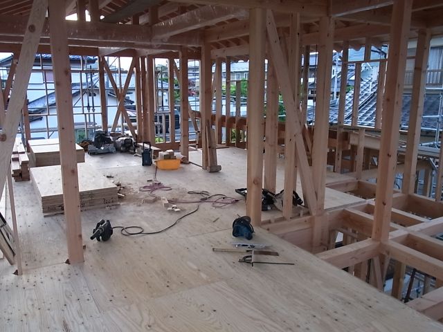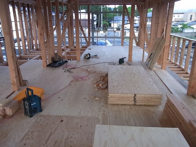 24㎜の構造用合板を千鳥張りに張り始めました。