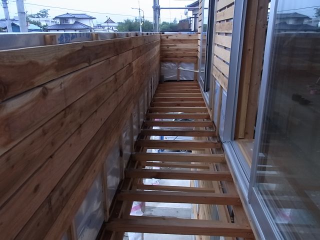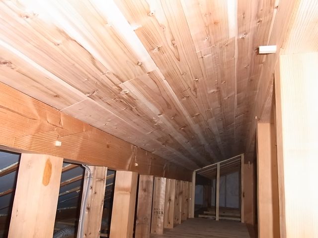 ベランダ内側のザラ板張りとロフト部分の天井杉板が張られました。