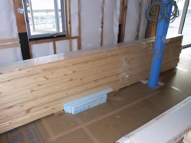 壁の仕上げ材のパインが搬入されました。
