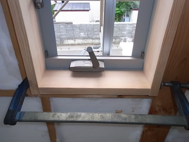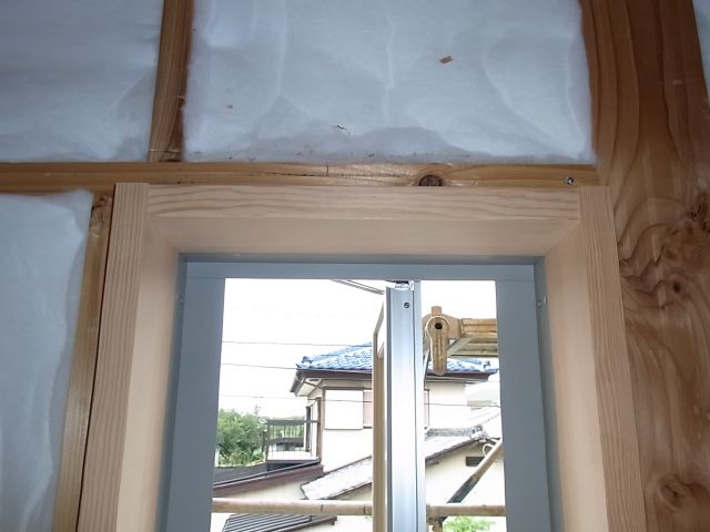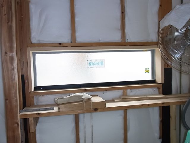 FIX窓枠、縦すべり出し窓枠、勝手口ドア枠の取付が行われました。