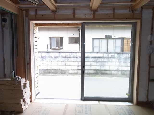 リビングの大きいメインの窓枠が取付けられました。