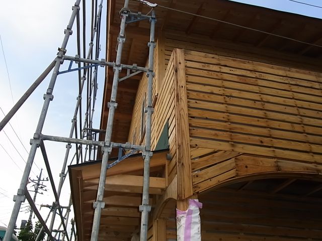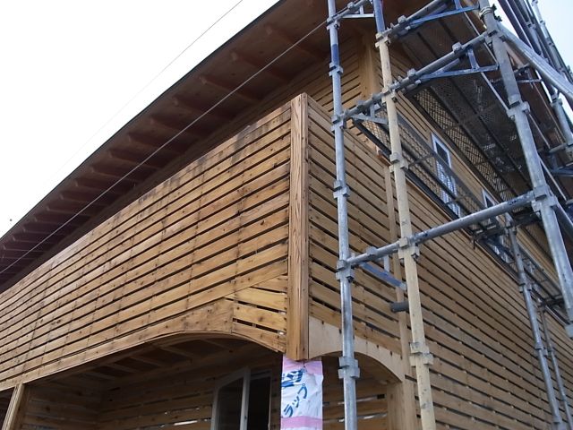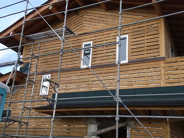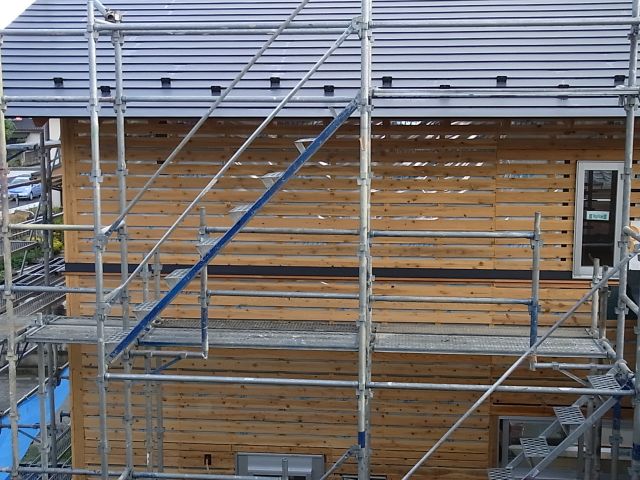 ベランダ手摺のザラ板も張られ、外壁も100%完了です。