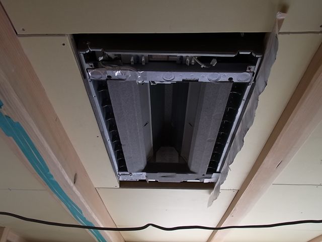 天井カセット型エアコン設置。スイッチBOXコンセントBOX取付・照明配線分岐。