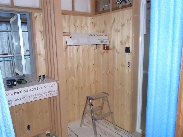 キッチン廻り収納内、脱衣所廻りのパイン板張り。