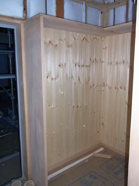 食品庫の棚板加工取付・巾木加工取付・パイン板張り完了。