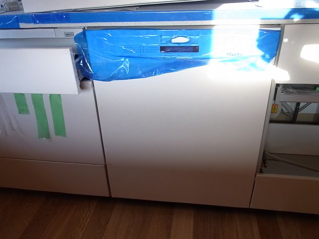 食洗機のパネル取付。エアコン本体の取付。洗面手洗器のコーキング。