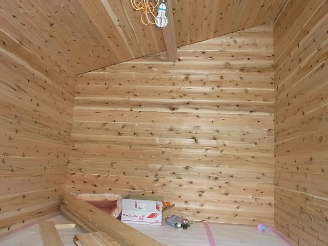 内部の杉板張りと外部北面の杉板張りを行いました。