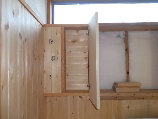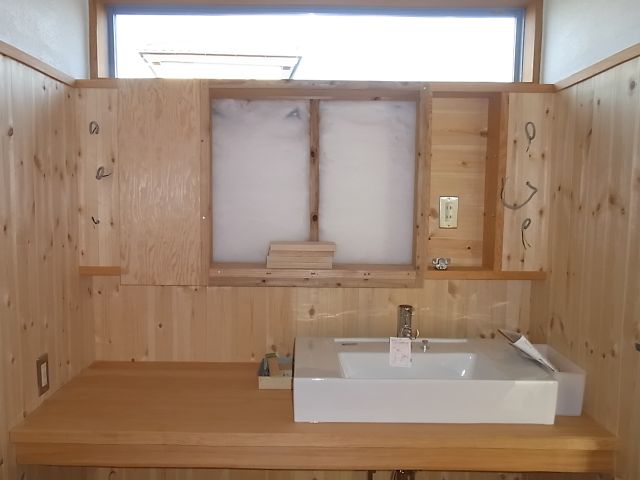 洗面収納に棚柱が付いていたのですが、ダボの方が使い勝手が良いということで、棟梁が変更してくれました。