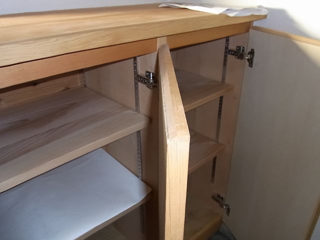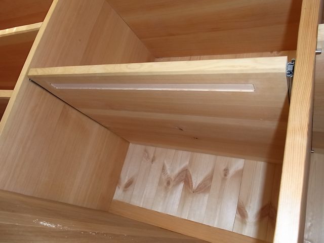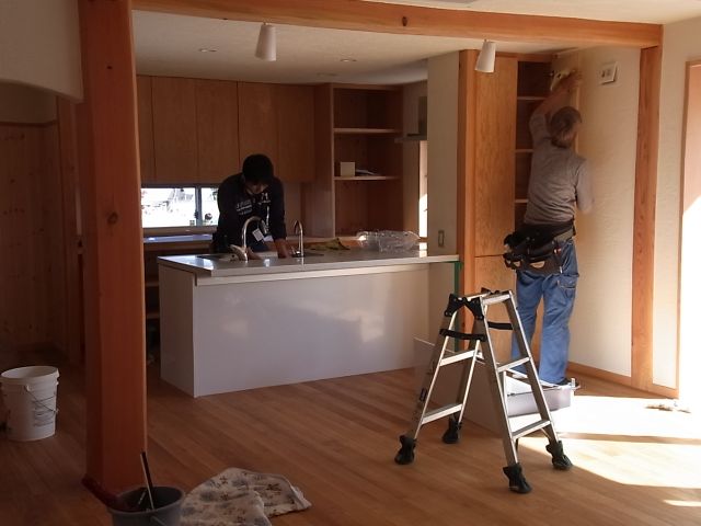キッチンスライド棚引手の彫り込み。一部シミ抜き。洗面鏡受け枠取付。