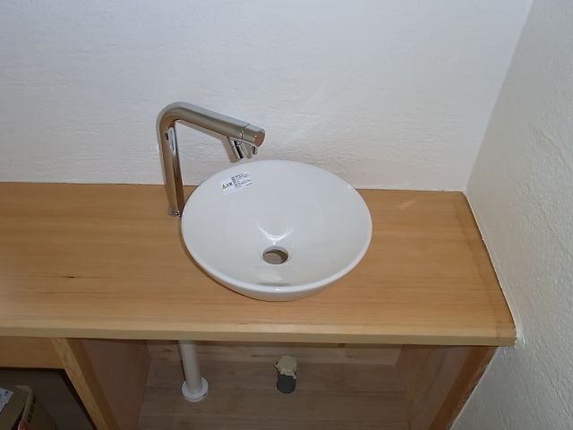 便所の手洗器と水栓が搬入され設置位置を決め、手洗器の取付(穴あけ)を行いました。