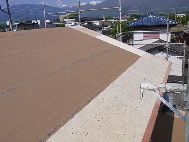 アスファルトルーフィングを敷きました。重ね幅も確認しました。