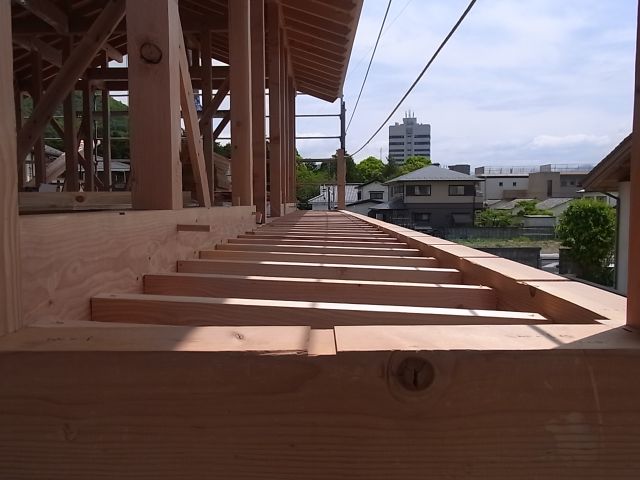 昨日の続き、ベランダ根太施工、水勾配がとれるように微妙に下ってます。