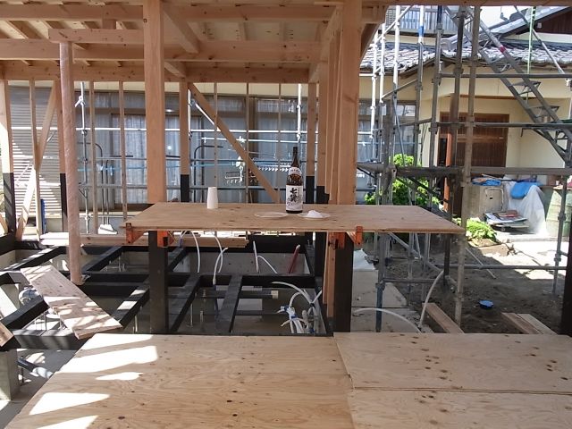 棟梁を中心に、家の四隅の柱にお酒、お米、お塩を撒いて清めます。