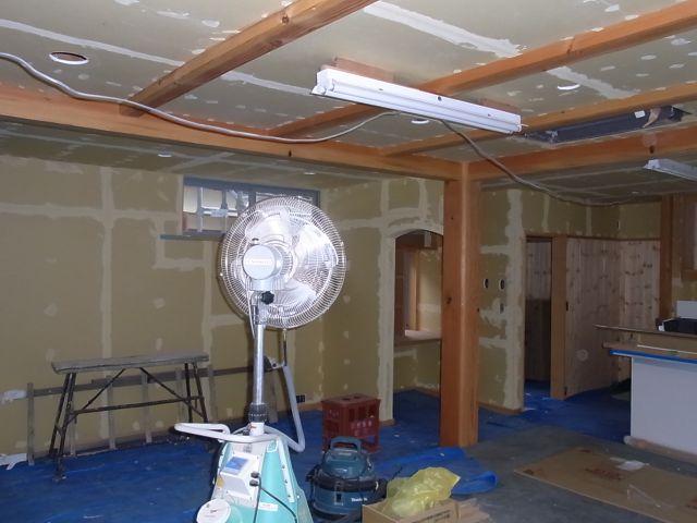 内部へ入っていきます。床の養生とプラスターボードの継ぎ目の下地処理が行なわれました。