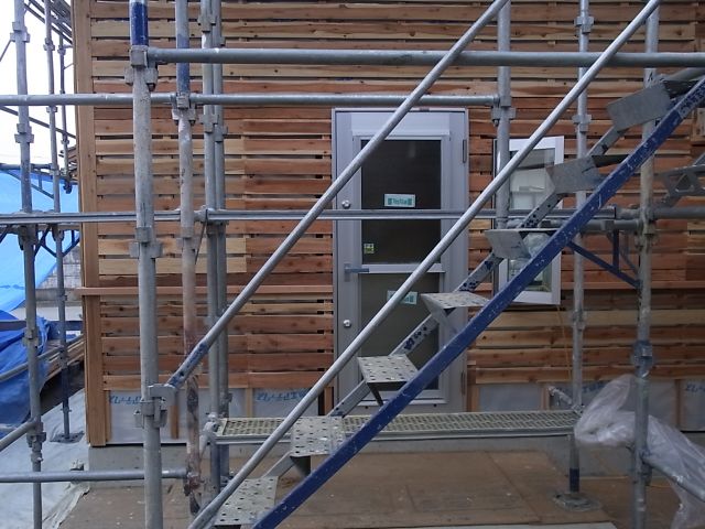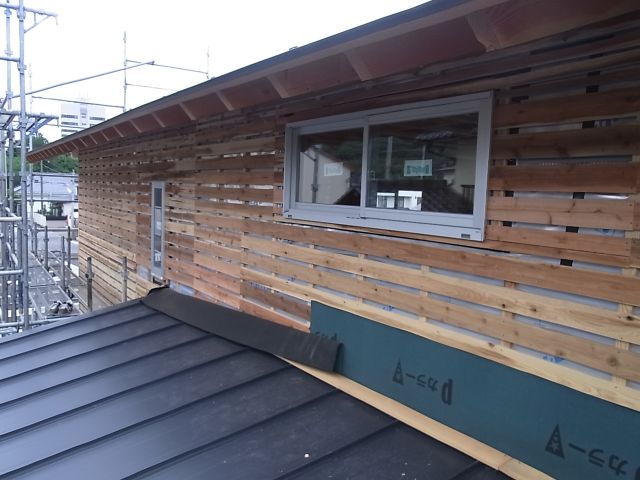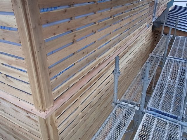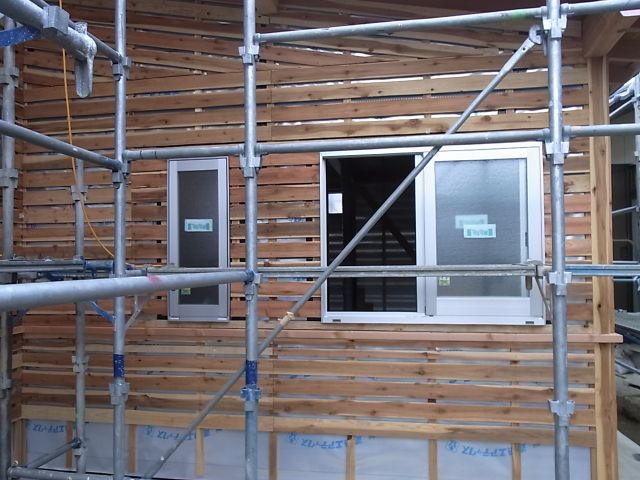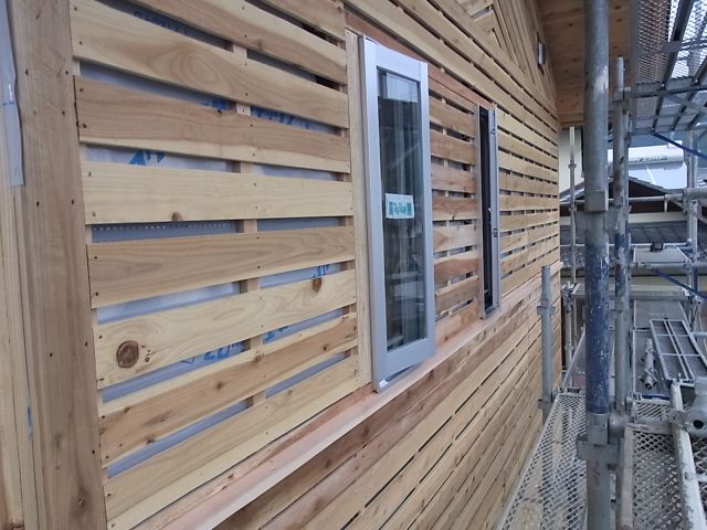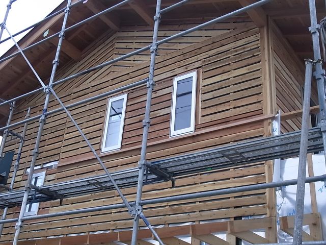 一,二階のサッシ周り通気胴縁・ザラ板張りを施工しました。