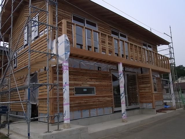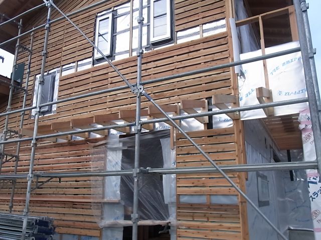 二階南面通気部材取付・通気縦胴縁施工・ザラ板一部施工。