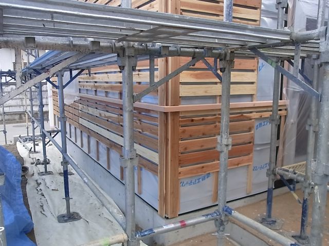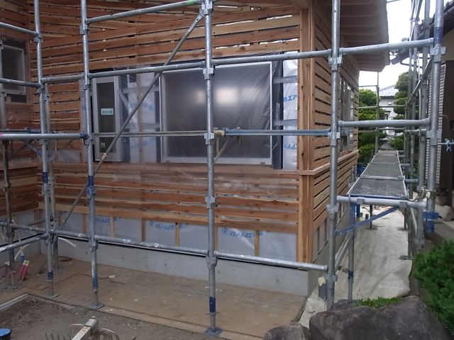 一階通気胴縁・ザラ板張り・帯の取付が行われました。