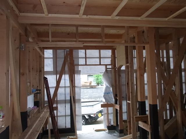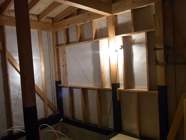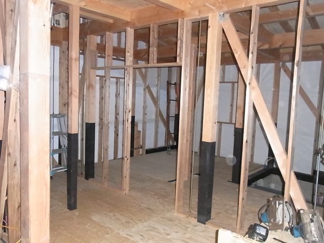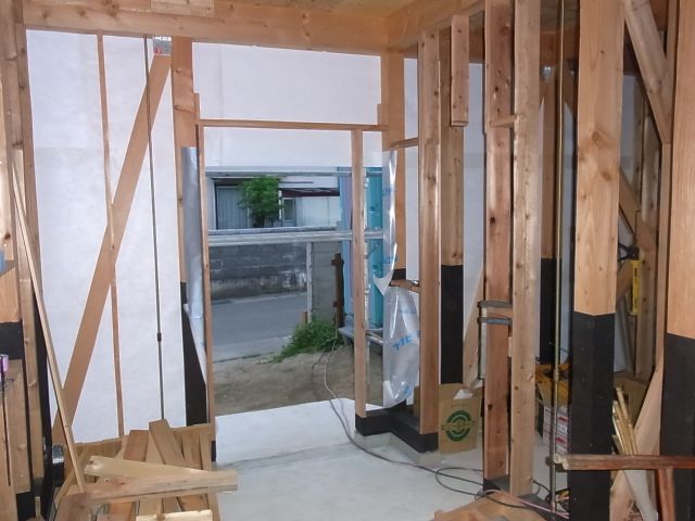一階玄関部分の間仕切、開口部部分の下地組が施工されました。