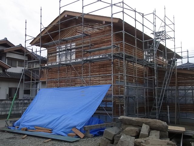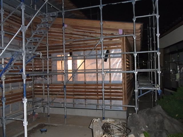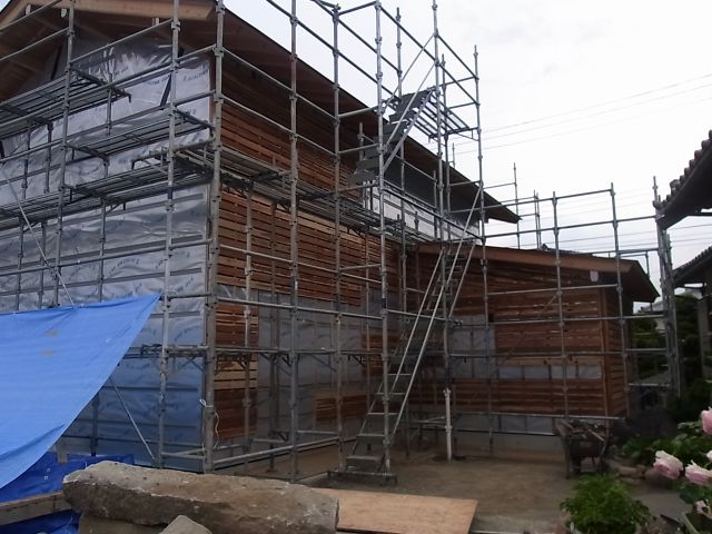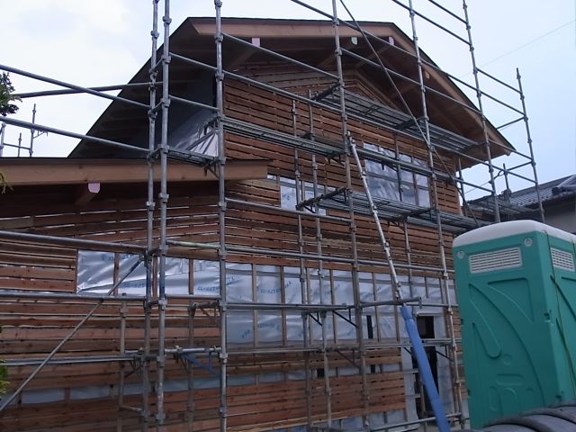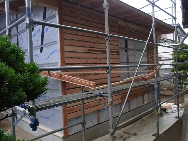 通気縦胴縁ザラ板張りが終わったので、