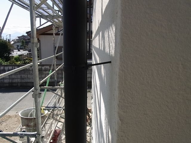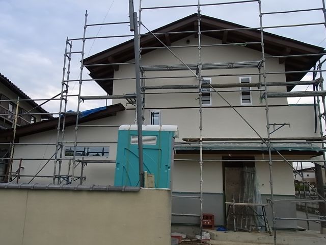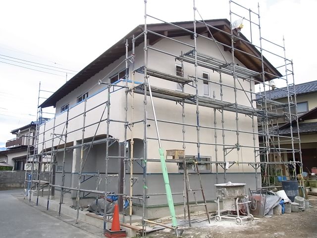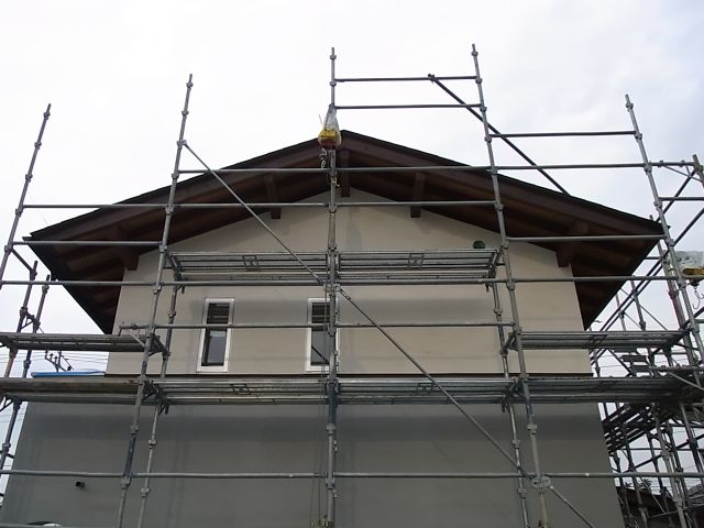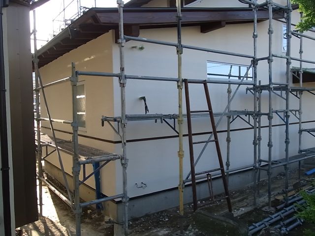 二階建て部分北面、南面二階部分、東面一階帯ラインまで完了しました。