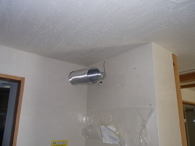 キッチン換気扇の穴あけ、洗面器排水トラップ取付。